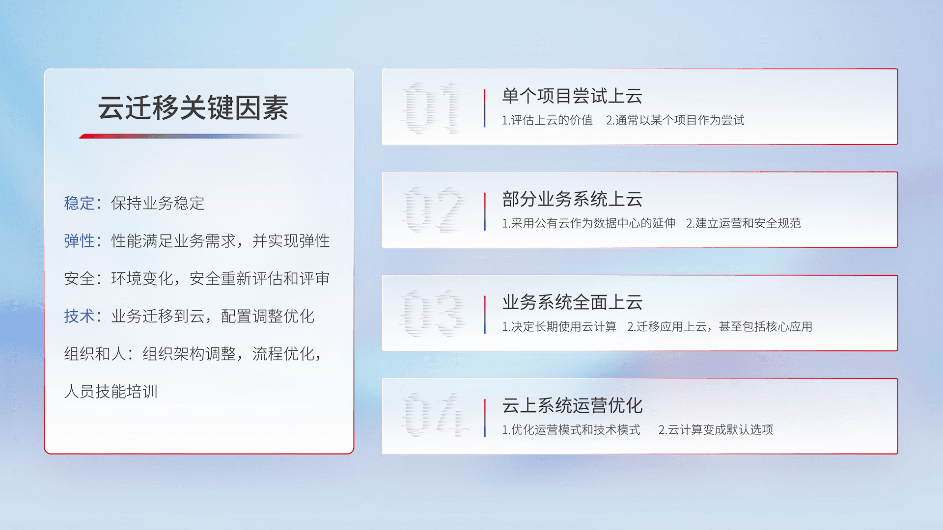 结合实际业务,,,,从规划设计、、、、云平台选型、、云原生改造、、、、数据迁移、、集成交付,,迁移全过程为客户识别最佳上云路径,,,做好风险识别管理,,设计网络架构、、、身份权限、、、安全审计合规、、、操作审计、、、、日志审计、、监控告警策略、、多站点容灾设计等,,,,对云上基础设施进行整体规划,,提升IT治理水平,,,以满足弹性、、高可用、、、高性能的需求。。