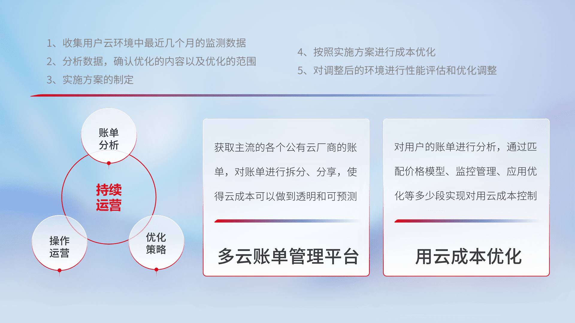 通过多云纳管,,,以统一的资源数据模型把客户的云资源进行抽象和封装,,,,进而实现对多云资源的统一操作,,保障云资源管理的可靠性、、稳定性与可用性。。量身定制化运维内容,,,配置、、开发运维、、、、补丁管理、、备份、、监控、、、、认证和访问管理、、、、审计和日常巡检等,,,,保障在用云过程中的可靠度,,稳定度以及高可用率。。。。
